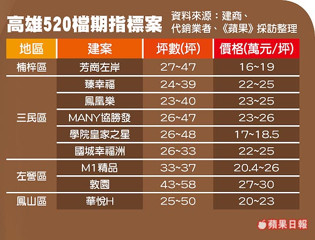 延續高雄329檔期總銷逾440億元,新政府上任之際,高雄房市出現少見520檔期,華友聯、隆大等上市建商均推新案,以自住型首購與首換宅為主,各個案場平均周來人數40~50組,部分建案打出區段相對低價吸客,整體買氣較去年提升逾3成。
