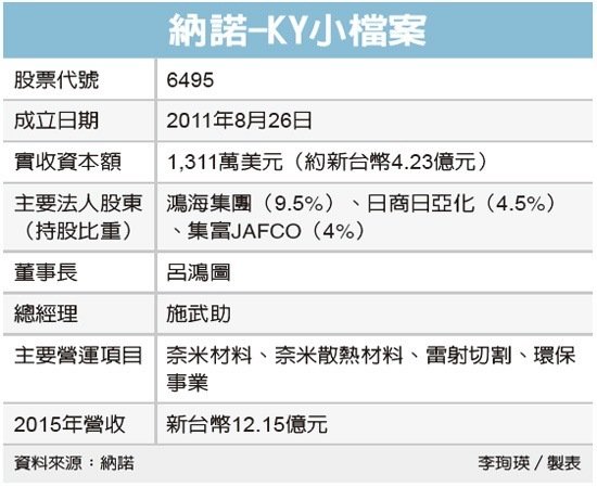 納諾預計本周三(27日)在台公開發行,8月登錄興櫃,11月送件申請股票上櫃,其股東來頭不小,鴻海集團持股9.5%,是最大單一法人股東,日本LED大廠日亞化持股4.5%、日商集富(JAFCO)占4%。納諾朝資本市場邁進,將成為鴻海集團另一隻上市櫃小金雞。