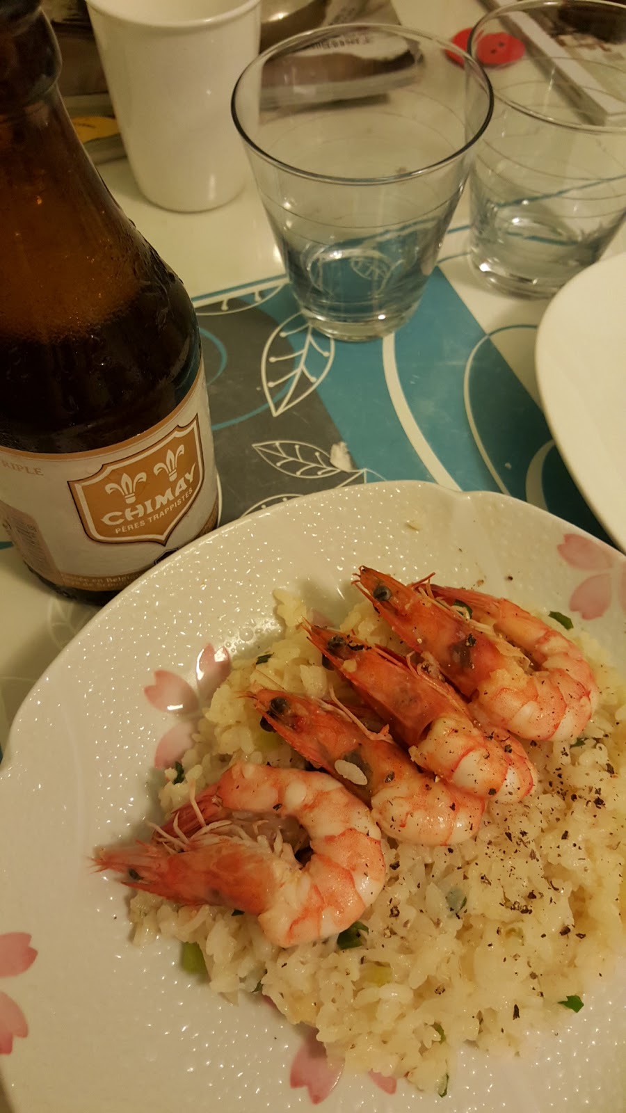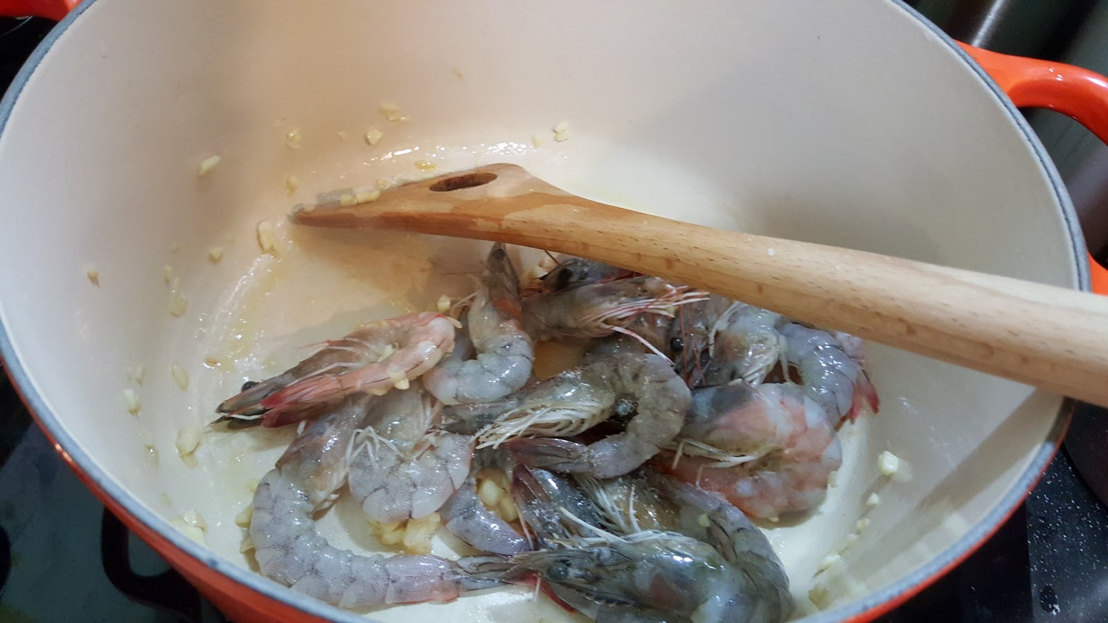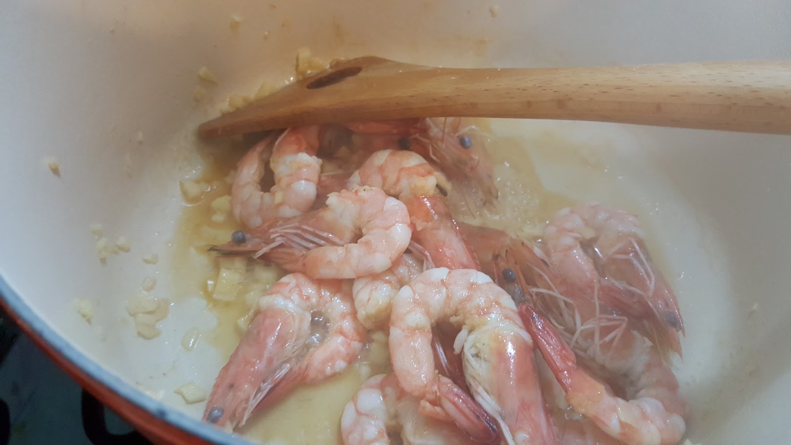 加入處理好的蝦子拌炒。動作要溫柔一點,為了擺盤好看,頭跟尾不能段阿~~XD 蝦子呈現半熟時,加入奶油;待奶油融化後加入米酒及鹽巴調味。