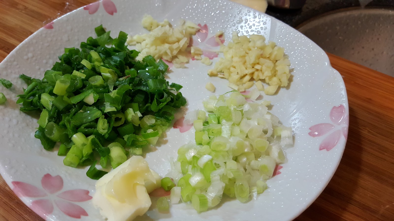- 葱 - 適量,約三根。分葱白及葱綠切細段備用。