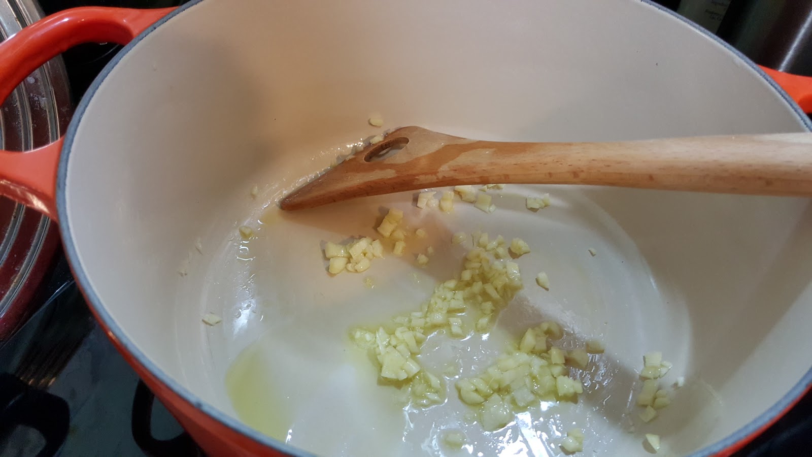 鑄鐵鍋就位,冷鍋加入橄欖油,一半份量的蒜頭與薑爆香。
