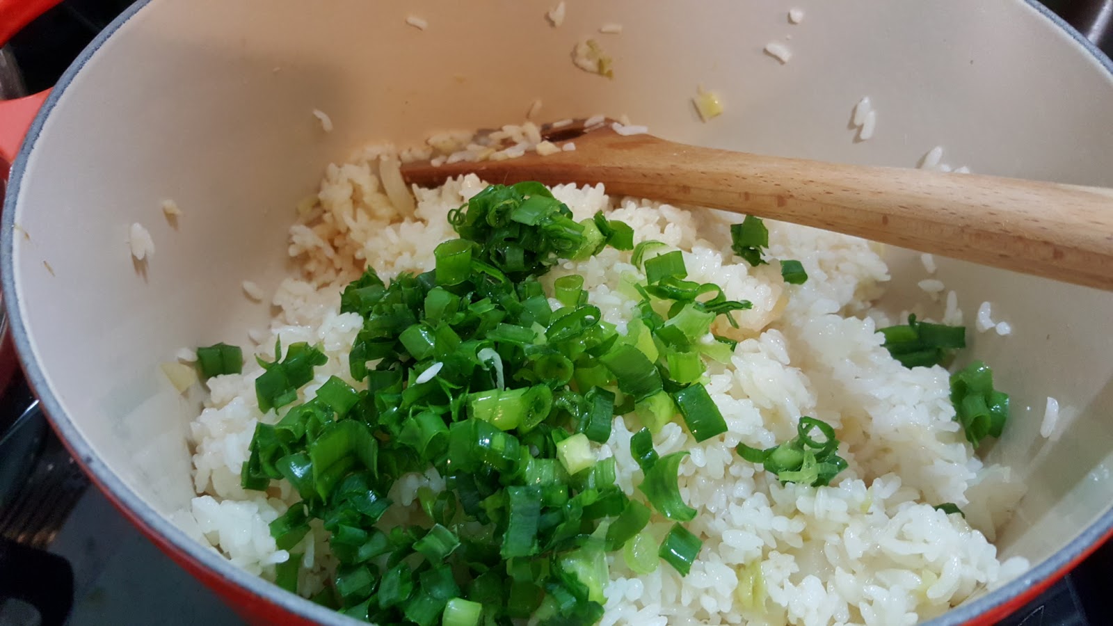 在原鍋(原剩下的湯汁保留在鍋中)加入橄欖油爆香剩下的蒜、薑及葱白。