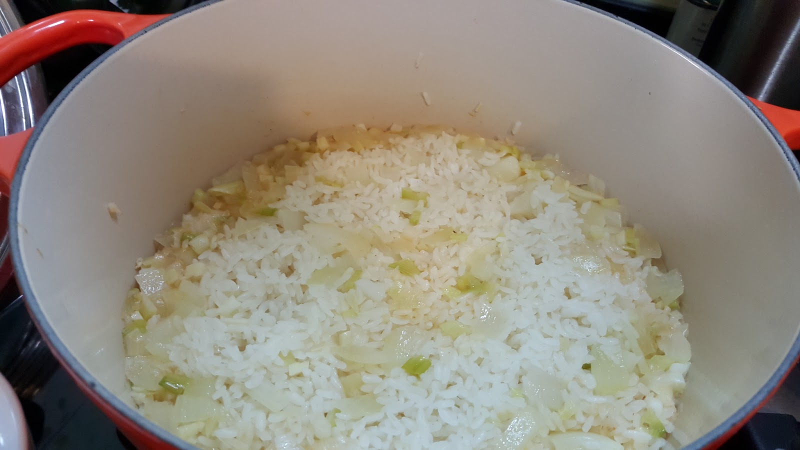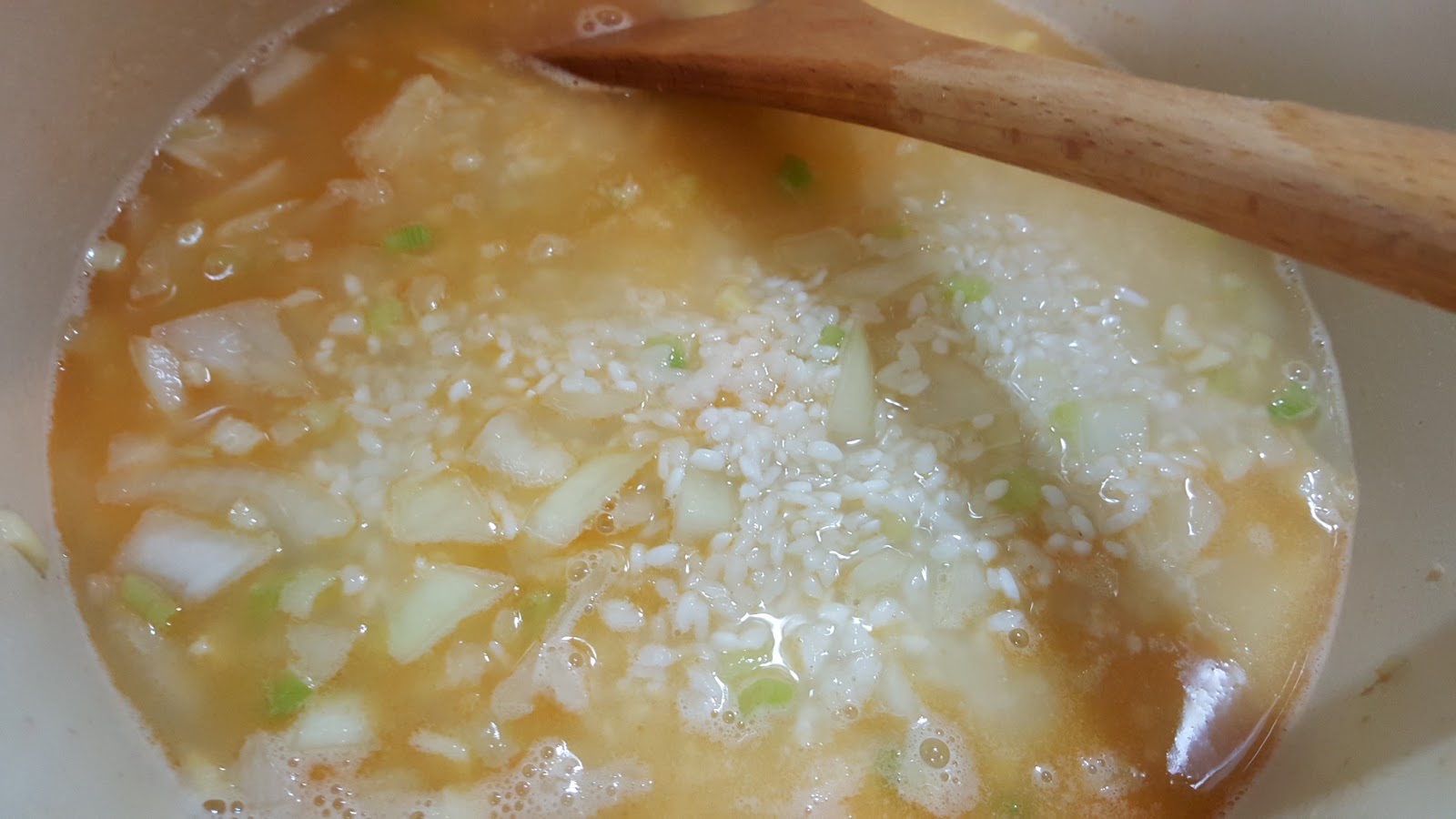 加入奶油待融化後,將洗好的米加入簡單拌炒一下後,加入兩杯份量的水。水滾後加入盬巴調味;然後蓋上鍋蓋,轉小火繼續煮八分鐘。